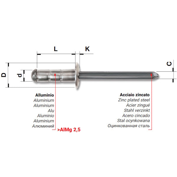 Far rivetti a strappo multistadi Multifar a testa cilindrica con boccola in alluminio e chiodo in acciaio....