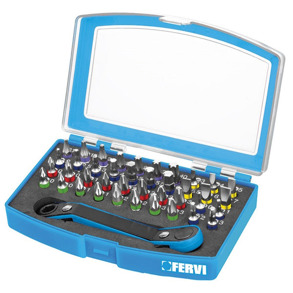 Fervi serie di inserti bits e cricchetto reversibile art.0402. Pratico e funzionale astuccio con coperchio trasparente. All'interno sono collocati 40... Per saperne di più