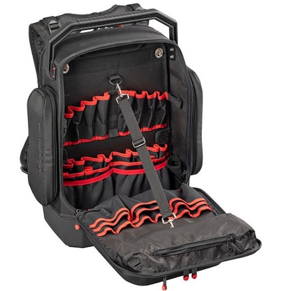 • Studiato per tecnici, manutentori e installatori, questo zaino porta attrezzi è progettato per il trasporto sicuro e organizzato di utensili, accessori, documenti e notebook fino a 17”.