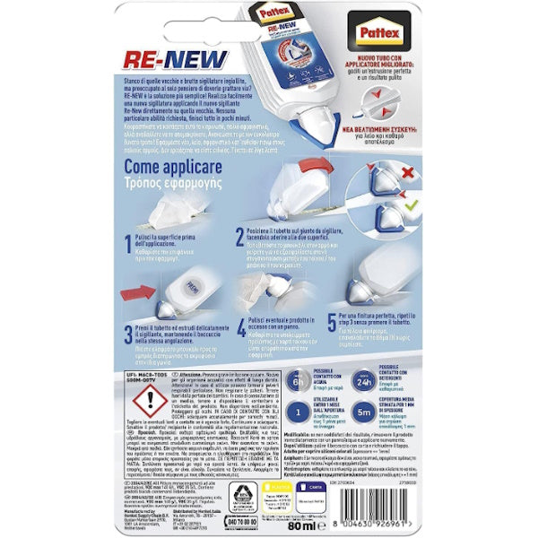 • Pattex Renew è un silicone base acqua pronto all’uso, adatto a rinnovare le sigillature in ambito sanitario con un’eccellente resistenza alla muffa.
