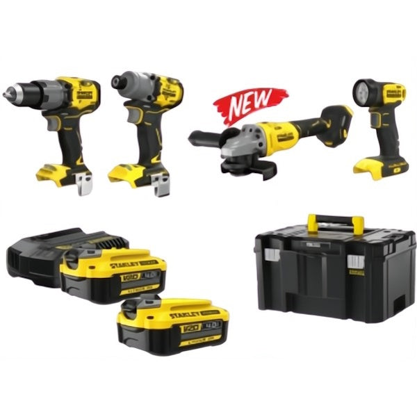 STANLEY KIT TRAPANO + AVVITATORE + SMERIGLIATRICE + TORCIA 18V 4,0AH